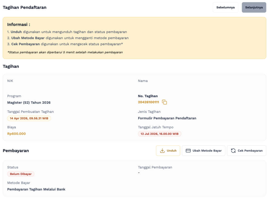 - Klik Tombol Buat Tagihan, selanjutnya Anda akan melihat No. Tagihan seperti di bawah ini (Biaya berbeda-beda tergantung jenjang yang diambil). Apabila Anda sudah membayar namun status Pembayarannya tidak berubah, silakan klik tombol Cek Pembayaran