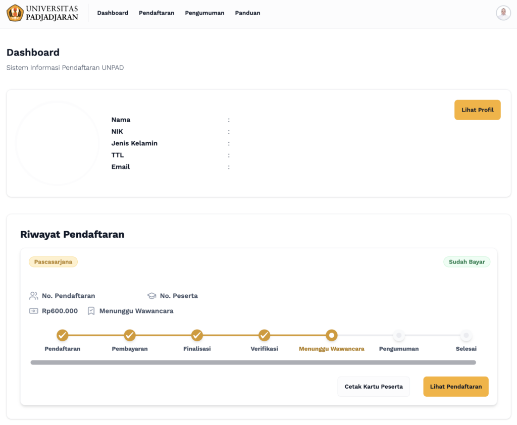 - Setelah melakukan Finalisasi Pendaftaran, silakan klik Tombol Dashboard untuk melihat bahwa Anda telah menyelesaikan pendaftaran (Ditandai dengan adanya Riwayat Pendaftaran). Apabila sudah benar silakan klik tombol Lihat Pendaftaran dan melihat Hasil Verifikasi dokumen-dokumen yang sudah diunggah.