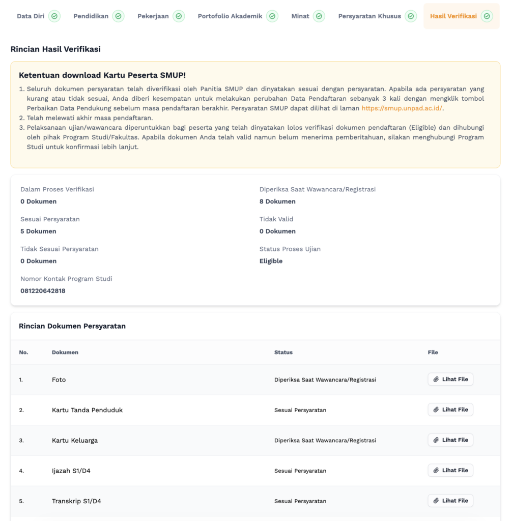 - Pada laman Hasil Verifikasi Anda akan melihat Dokumen Dalam Proses Verifikasi, Sesuai Persyaratan, Tidak Sesuai Persyaratan, Dokumen Diperiksa Saat Wawancara/Ujian, Tidak Valid, dll