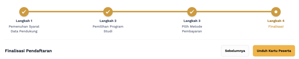 Finalisasi Pendaftaran Berhasil! Pendaftaran Anda telah berhasil difinalisasi. Anda dapat melanjutkan ke tahap berikutnya sesuai ketentuan masing-masing jalur pendaftaran. Informasi lebih lanjut terkait langkah selanjutnya akan segera kami informasikan pada riwayat pendaftaran halaman dashboard. Pastikan Anda tetap mengikuti pembaruan informasi dari kami.